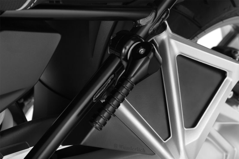Componente excepcionalmente útil e ergonômico. Otimiza a alavancagem – não apenas em uma máquina totalmente carregada. Esta alavanca dobrável é montada à esquerda do quadro através de um console sólido e equipado. Uma trava de rotação adicional acoplada ao suporte para apoios de pés e porta-caixas garante que ele se sente firmemente. Quando dobrada, a máquina é visivelmente mais leve e, acima de tudo, mais segura para colocar no suporte central. Isso se deve ao fato de que a aderência antiderrapante fica bem na sua mão e você pode transferir significativamente mais força para ele do que tubos de quadro que são mais difíceis de segurar ou até mesmo inacessíveis por causa da bagagem. Após o levantamento, a aderência se afasta discretamente em sua posição de descanso. Um mecanismo garante que a aderência se esvai firmemente quando dobrada. Fabricamos nossa alavanca de macaco usando alumínio de alta qualidade e o design é funcional.