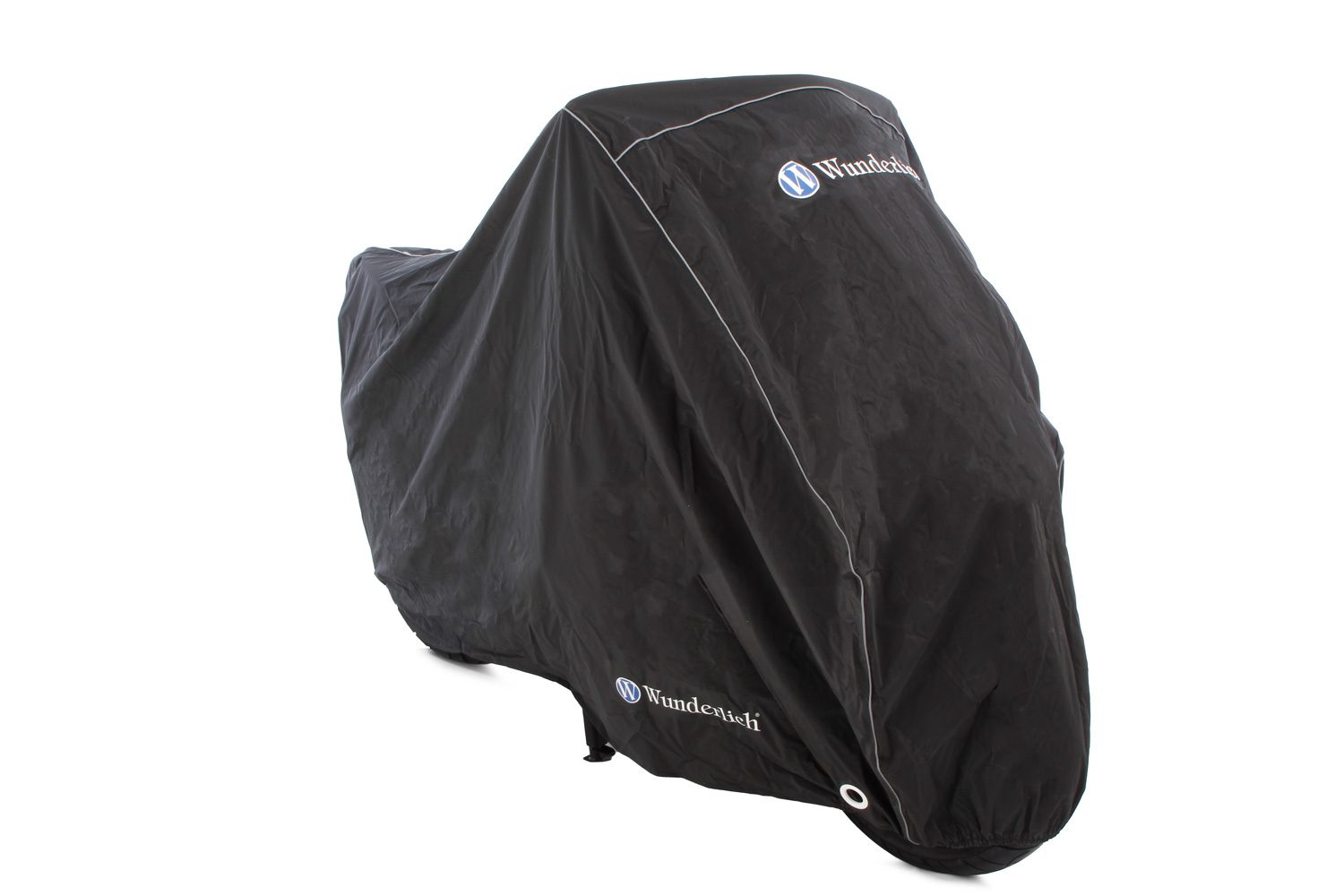 - Três travas ajustáveis permitem ajuste individual da largura na área traseira – elas são facilmente acessíveis na parte superior da lona – para que a motocicleta possa ser armazenada sob a lona com ou sem uma caixa
