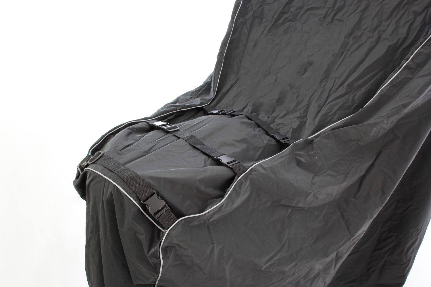 - Uma tira é presa na parte inferior para fixação à prova de tempestades da capa externa entre as rodas da motocicleta